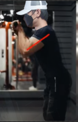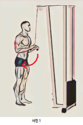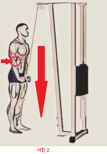 팔을 펴내리는 수축 동작 시 몸쪽으로 당긴다고 생각하지 말고
