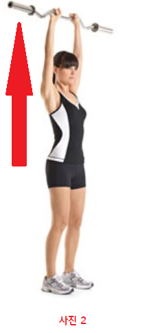 1 . 시작 자세로는 바벨을 양손으로 어깨너비 정도로 잡고 팔꿈치는 하늘을