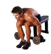 1 . 벤치 끝에 엉덩이를 살짝만 걸터앉고 양손에 덤벨을 쥔 상태에서 상체를 숙인다.