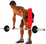 1 . 준비 자세는 상체를 앞으로 90도 숙이고 바벨을 어깨 넓이보다 한뼘정도 넓게 양손으로 잡는다.