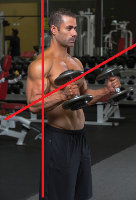 중량의 부하가 사선으로 있기에 어깨를 회전시켜 이두근의
