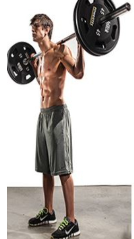 1 . 바벨을 목뒤의 승모근 부위에 올린 후 양손으로 잡고 발은 어깨너비로 벌린 준비자세를 만든다.