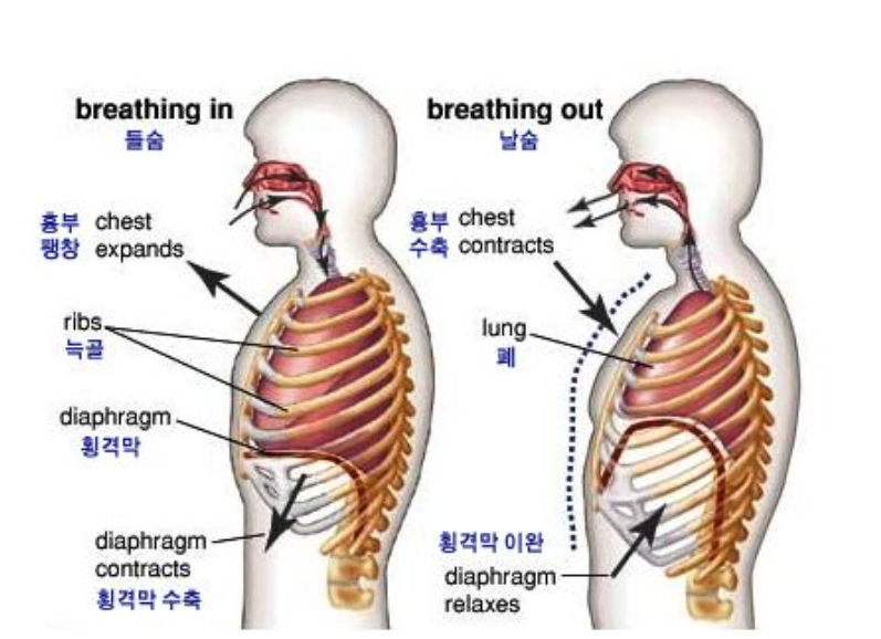 운동되는 부위의 근육이 수축이 될 때 숨을 뱉는다.