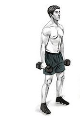 1 . 덤벨을 양손으로 잡고양발을 어깨너비로 벌려준 후 수직으로 자세를 고정한다.