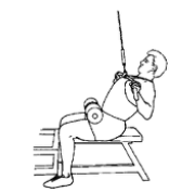 1 . 기구에 앉아 허벅지가 뜨지 않도록 고정하고 케이블 바는 어깨너비보다 2뼘 넓게 잡는다.
