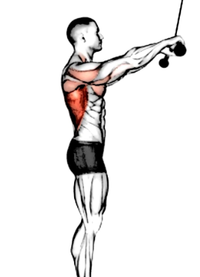 1 . 케이블 바를 팔을 쭉 펴서 어깨너비보다 약간 넓게 잡고 양옆으로 팔꿈치를 살짝 접는다.