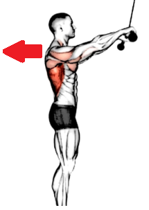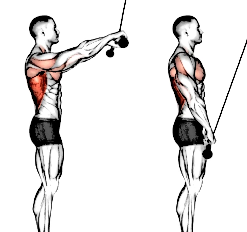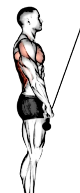 1 . 케이블 바를 팔을 쭉 펴서 어깨너비보다 약간 넓게 잡고 양옆으로 팔꿈치를 살짝 접는다.
