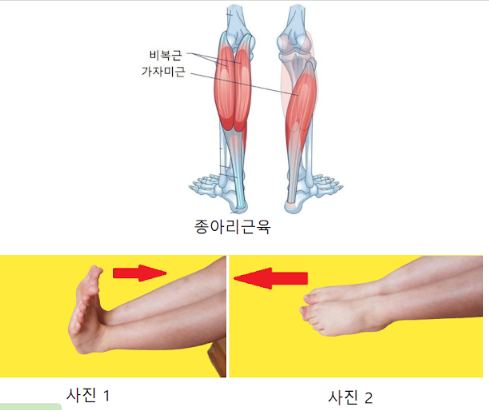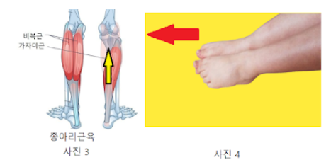 사진 3 의 종아리 근육이 당겨지면서 사진 4 의 발이 앞으로 향한다고