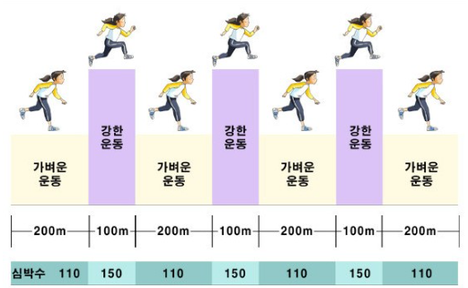 - 10-15초 휴식기를 가지며 400m 정도의 짧은 거리를 1-2분간 빠른 속도로 20회 정도 반복