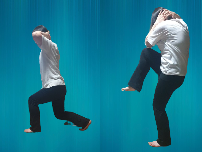 -일어서면서 동시에 왼쪽 무릎 왼쪽 팔꿈치를 닿게 하고