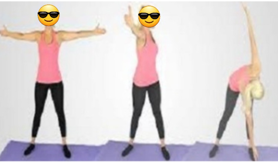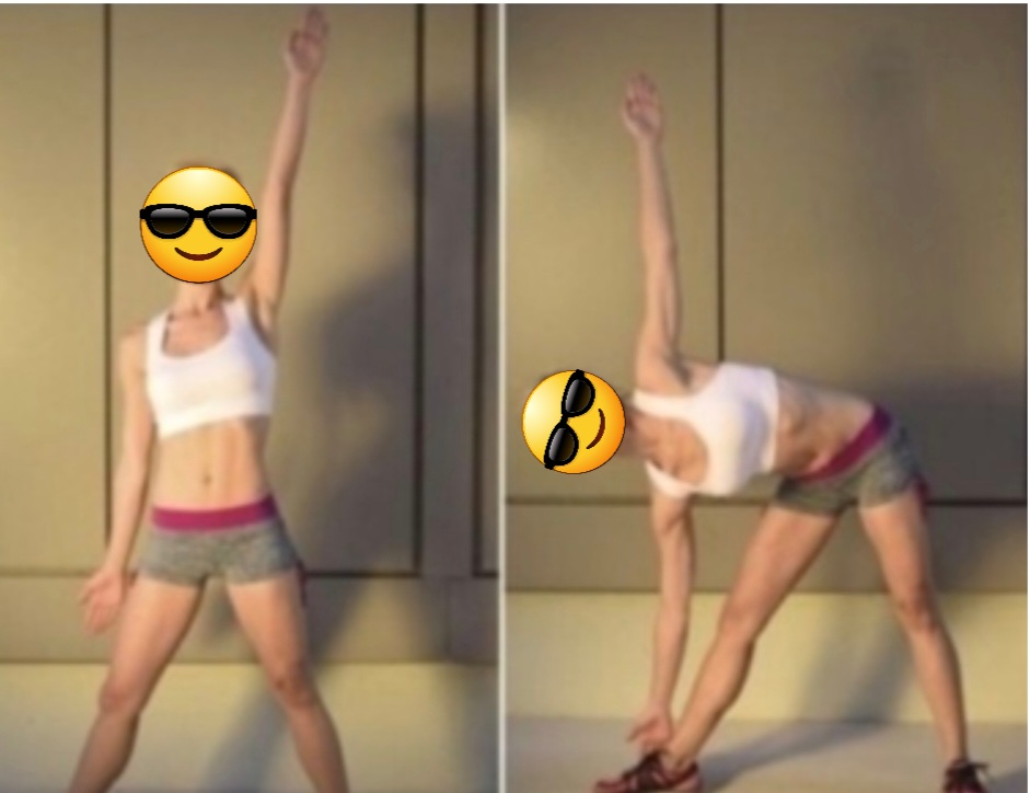 -허리를 숙여 오른손으로 왼쪽발 안쪽을 터치 후 왼손은 천정을 향해 뻗어 올린다.