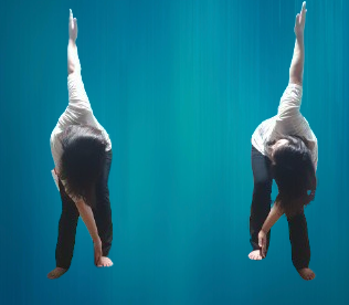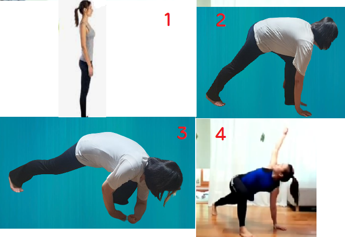 -허리를 숙여 오른손으로 왼쪽발 안쪽을 터치 후 왼손은 천정을 향해 뻗어 올린다.