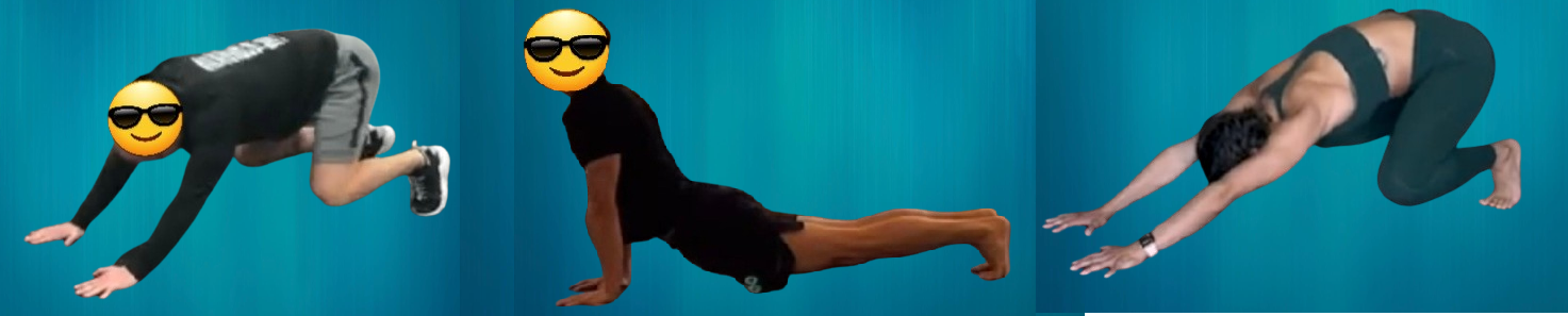 -양손으로 바닥을 짚고 양 발을 바닥에 대고 무릎은 2cm 띄운다.