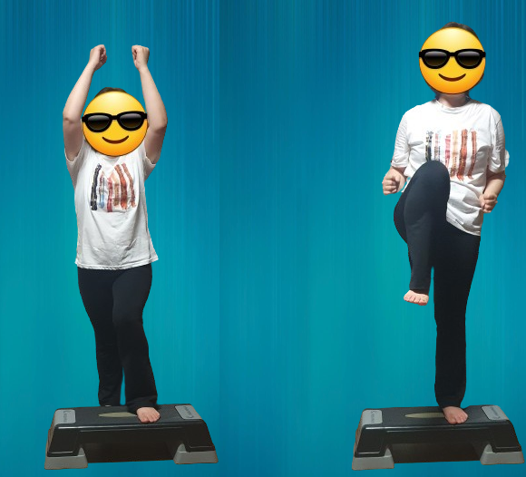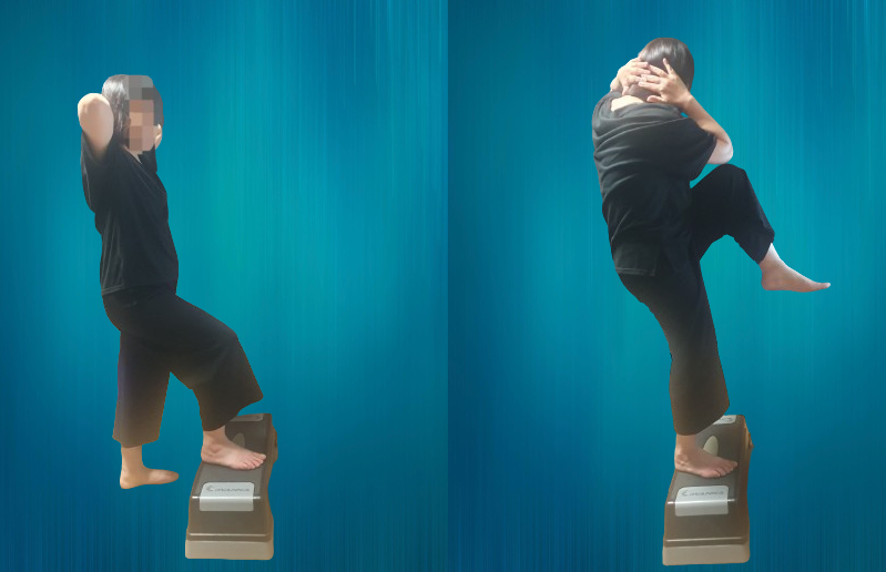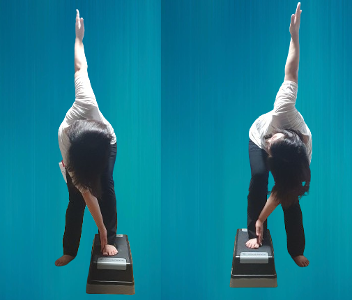 -스텝박스 위에 왼발을 올리고 양손은 하늘을 향해 뻗는다.