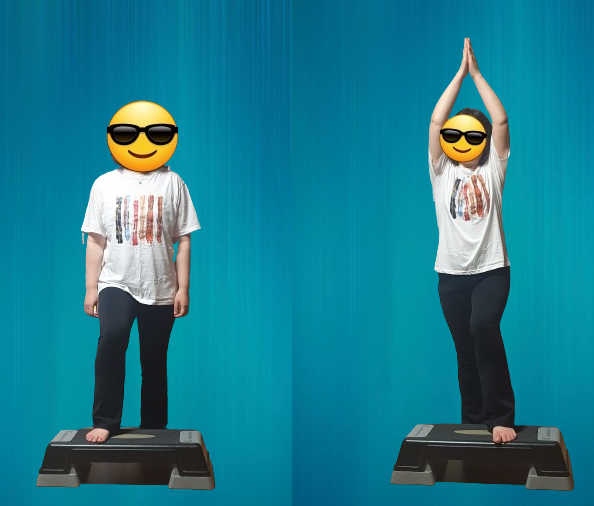 -스텝박스 위로 양 발을 올리고 올라서서 양팔을 하늘을 향해 뻗는다.
