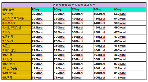오늘은 각 운동의 효과와 칼로리 소모를 알아 보겠다.