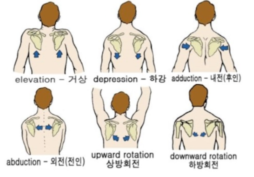 | 2.견갑골 가동성 1-1.견갑골 거상 1-2.견갑골 하강 1-3.견갑골 내전 1-4.견갑골 외전 1-5.견갑골 상방 회전 1-6.견갑골 하방 회전 |