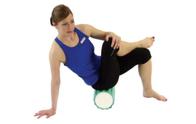 바닥에 앉아 한쪽 엉덩이 아래에 폼롤러를 가로로 놓습니다.