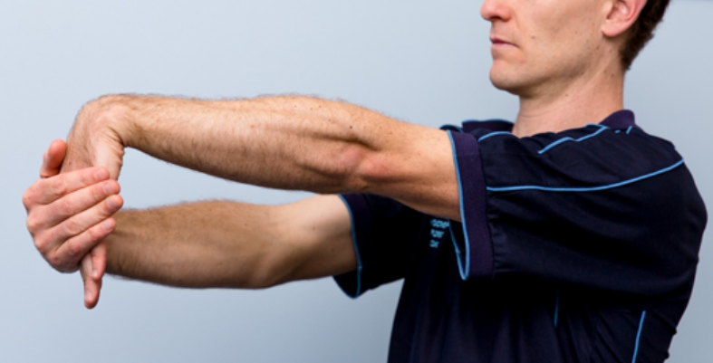 손목을 천천히 아래로 꺾은 상태에서 팔꿈치는 곧게 유지.