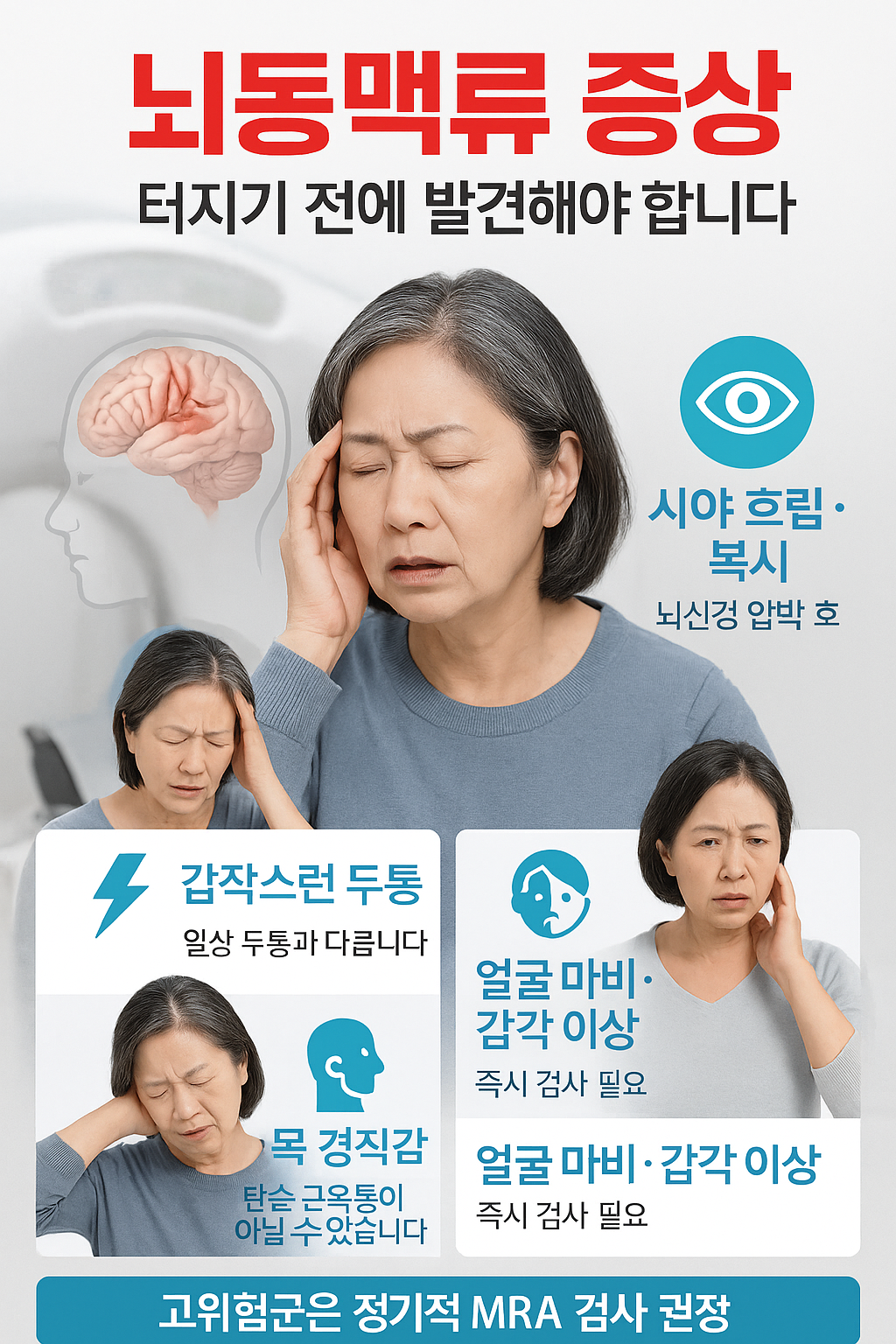 | 파열 시 증상 (응급상황) | 극심한 두통 | 환자들은 흔히 "인생 최악의 두통"이라고 표현합니다. 살면서 한 번도 경험하지 못한 최악의 통증이 갑자기 몰려옵니다. |