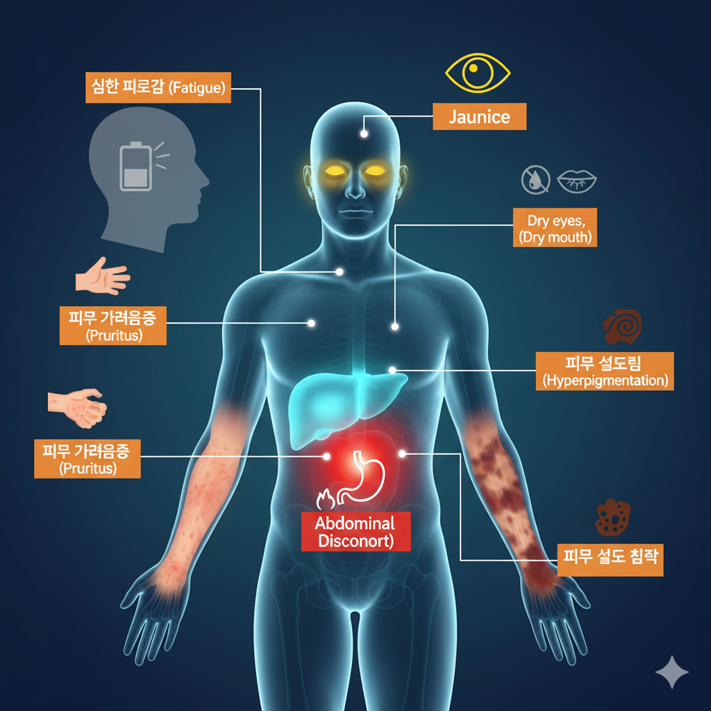 만성적인 피로(Fatigue)와 피부 가려움증(Pruritus)입니다.