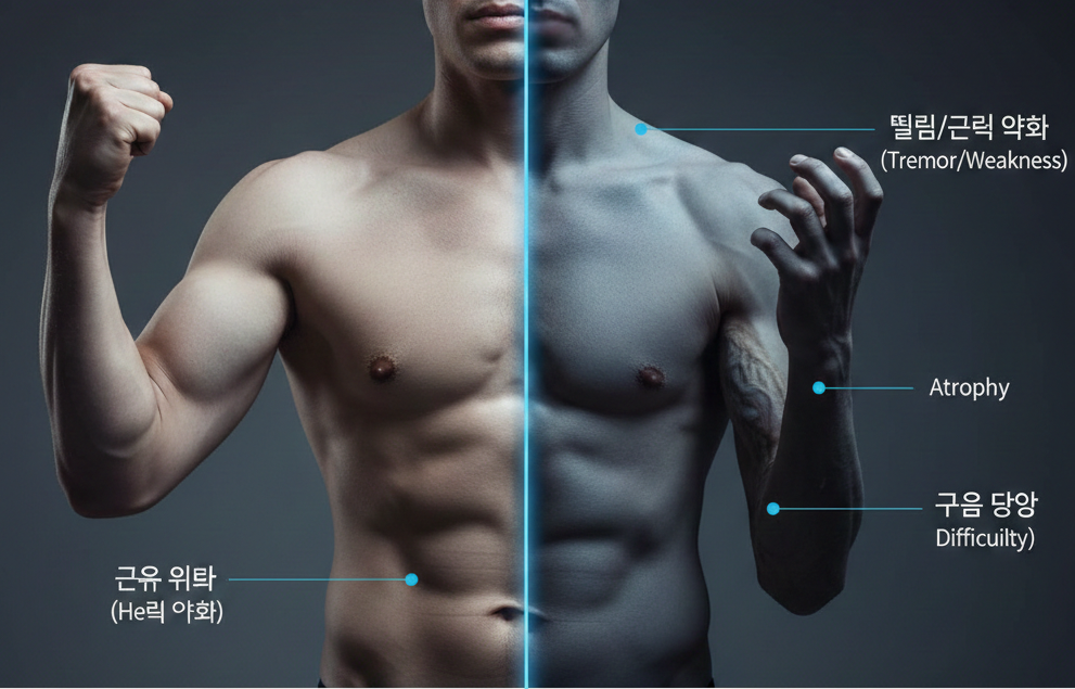 근육이 빠르게 약해지고 실제로 위축·마비가 동반됨